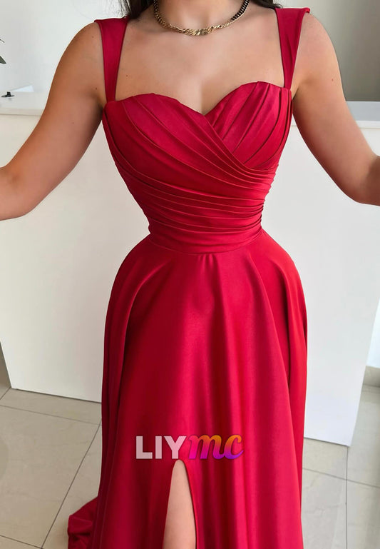 LP2316 - Sweetheart Straps Pleated A-Line High Slit Prom Dress