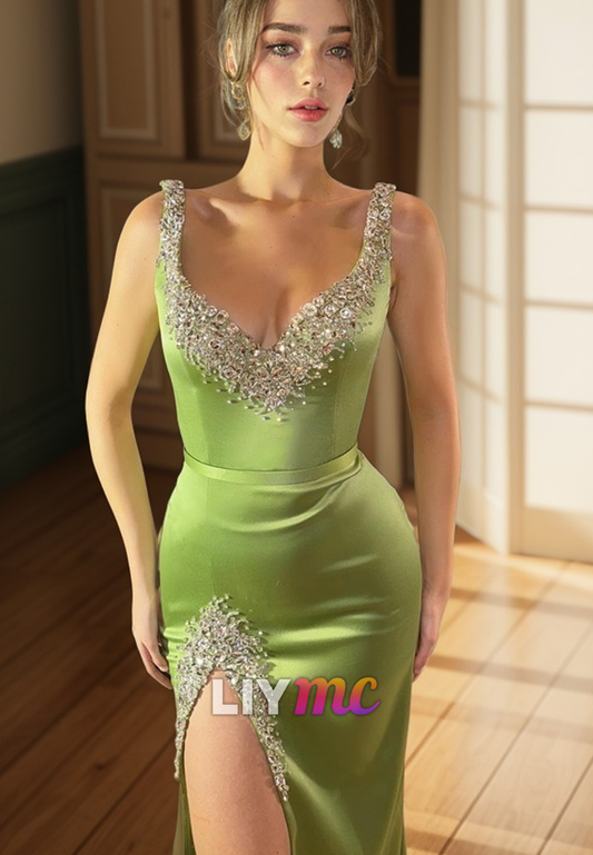 LP2271 - V-Neck Sleeveless Beaded High Slit Sleek Satin Sheath Prom Dress