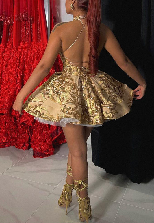 LY047 - Halter Sleeveless Appliques A-Line Pleated Short Homecoming Dress