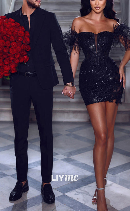 LY094 - Off-Shoulder Feathered Sequins Sparkly Short Homecoming Graduation Dress