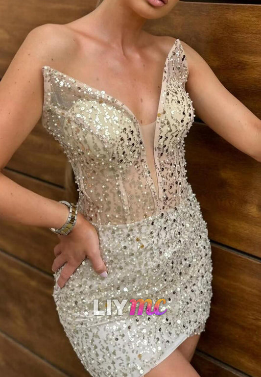 LY126 - Sheath V Neck Straps Sleeveless Fully Sequined Homecoming Dress