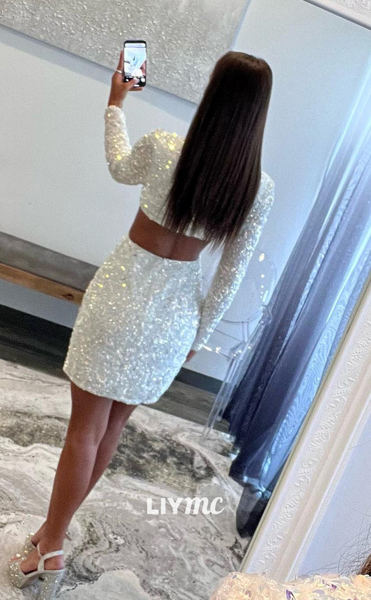 LY074 - V-Neck Long Sleeves Cut Outs Sequins Sheath Short Homecoming Dress