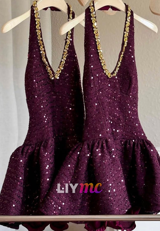 LY076 - V-Neck Sleeveless Sequins Sparkly Short Homecoming Graduation