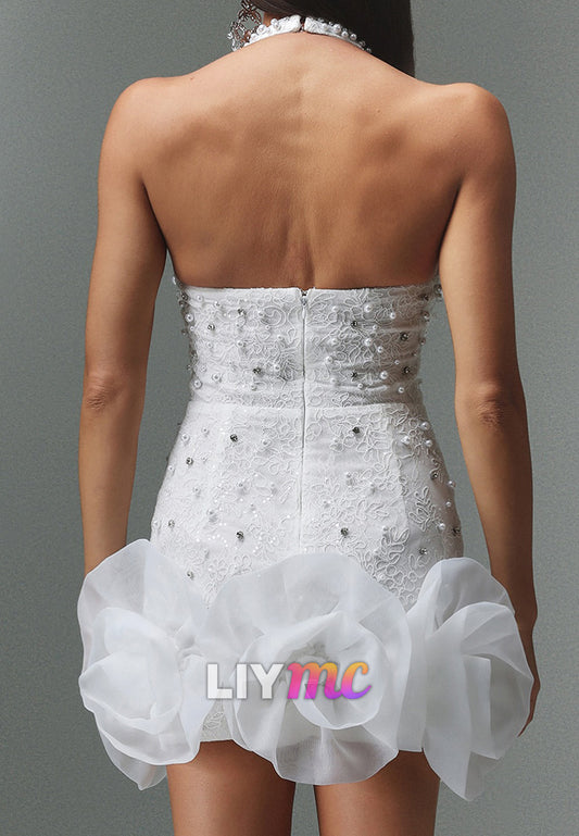Halter V-Neck Beaded Sheath Party Pearl Homecoming Dress