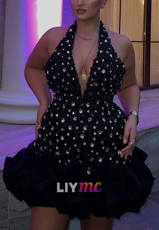 Halter V-Neck Beaded Sparkly A-Line Party Homecoming Dress