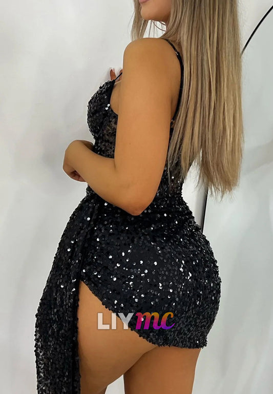 V-Neck Sequins Spaghetti Straps Sheath Party Homecoming Dress