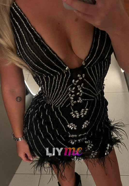 V-Neck Beaded Feathered Sheath Party Homecoming Dress