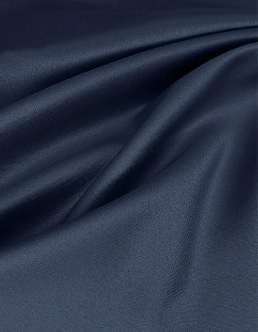 Elegant Navy Satin Gown with Off-Shoulder Pleated Bodice and Sheer Sleeves