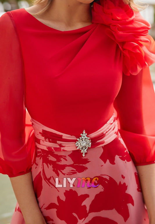 Scoop Long Sleeves Floral Printed A-Line Mother of Bride Dress