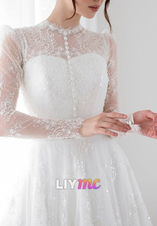 Half High Neck Long Sleeves Button Lace Appliques A-Line Wedding Dress