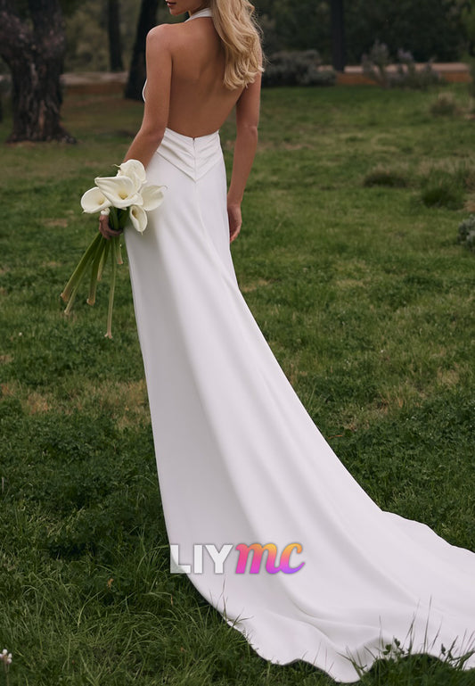 Halter V-Neck Sleeveless Backless Sleek Sheath Wedding Dress