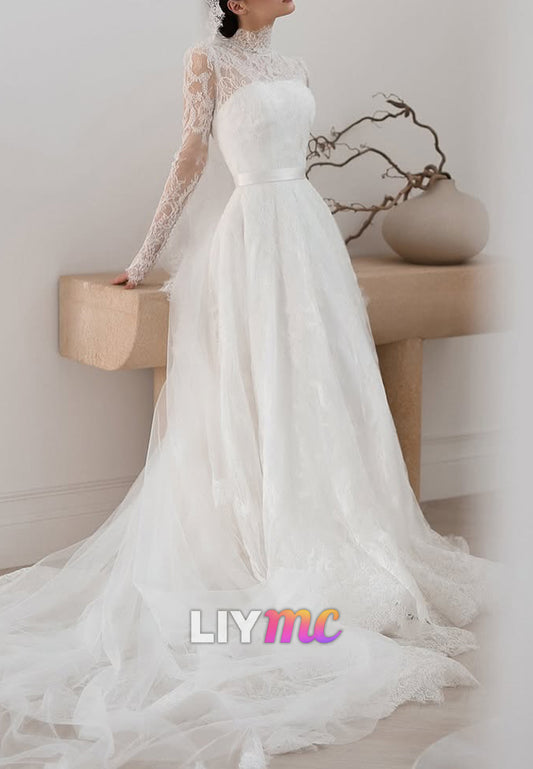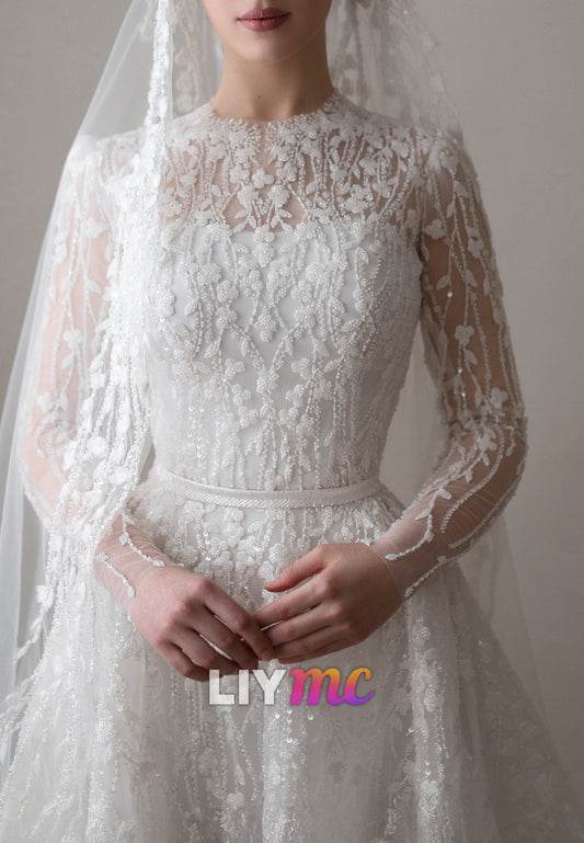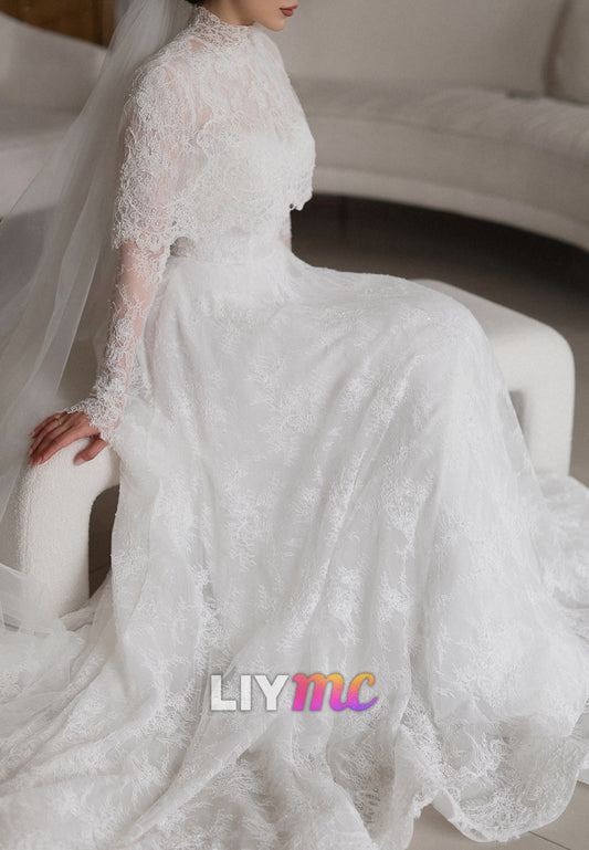 High Neck Long Sleeves Lace Appliques A-Line Wedding Dress