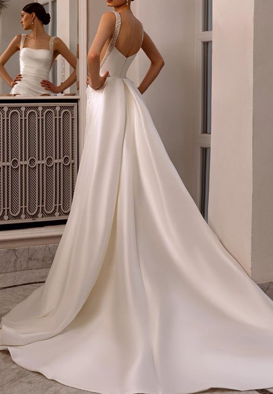LW712 - Square Sleeveless Beaded Sleek Satin Mermaid Sweep Train Wedding Dress