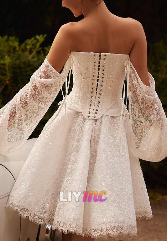 Off-Shoulder Pearl Sequins Two Piece Corset A-Line Short Wedding Dress