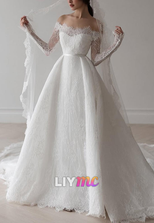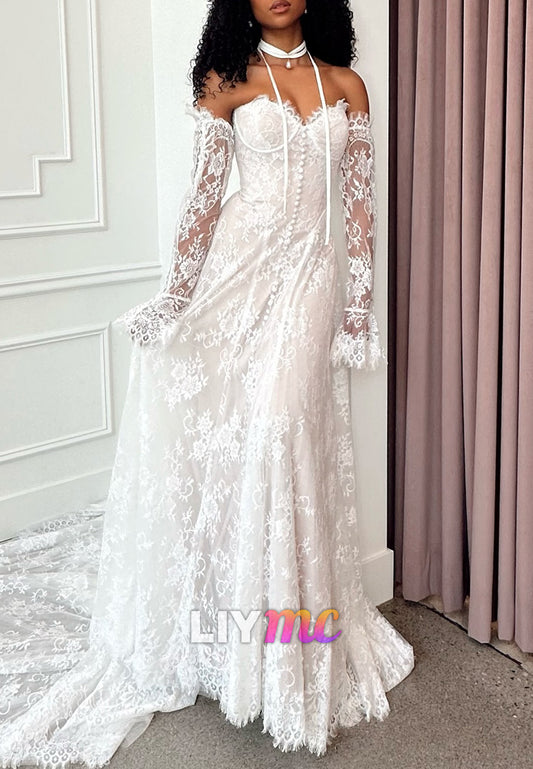 Off-Shoulder Long Sleevess Lace Appliques A-Line Wedding Dress