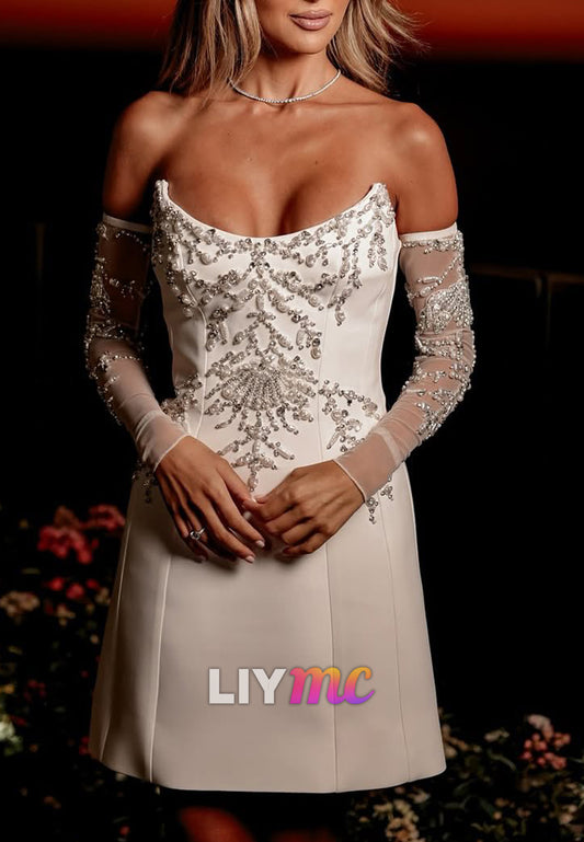 Off-Shoulder Sleeveless Beaded A-Line Satin Short Wedding Dress