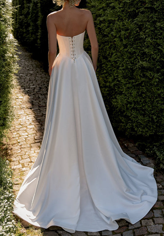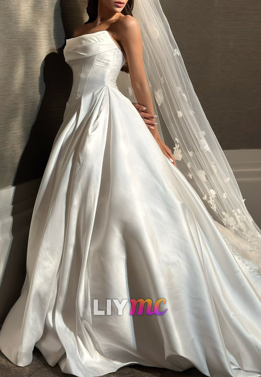 A-Line Strapless Sleeveless Satin Pleated Wedding Dress