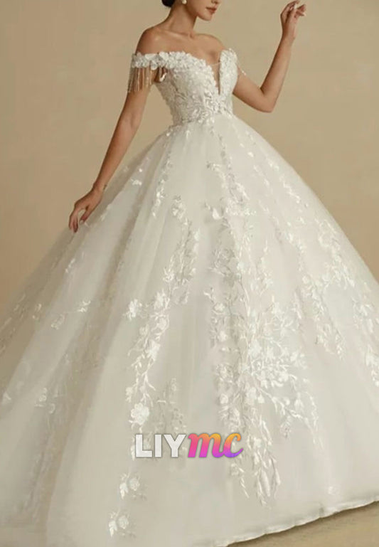 Off-Shoulder Sleeveless Floral Appliques Tulle Bridal Gown