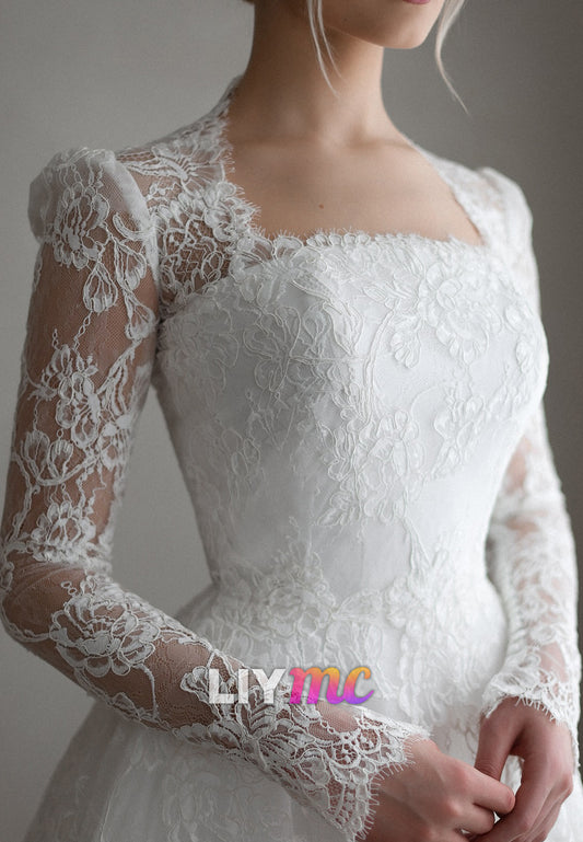 Square Long Sleeves Lace Appliques A-Line Wedding Dress