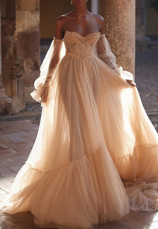 LW401 - Sweetheart Long Puff Sleeves Beaded Tiered Tulle Long Wedding Dress
