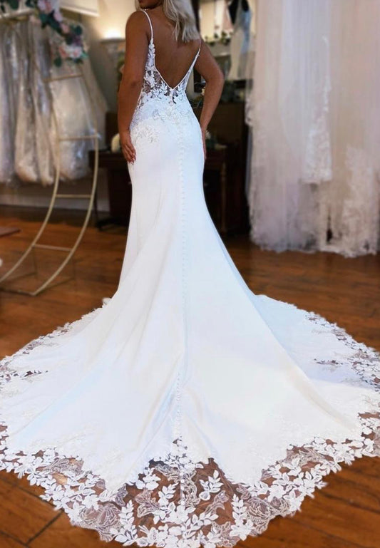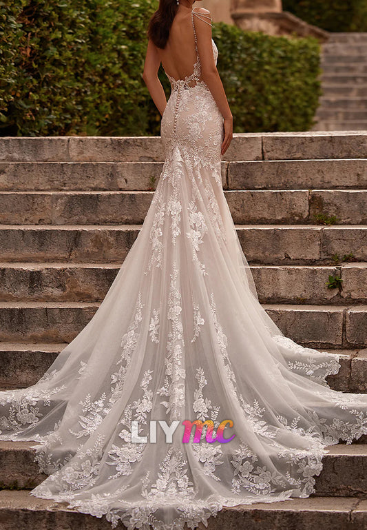 V-Neck Straps Lace Appliques Mermaid Wedding Dress