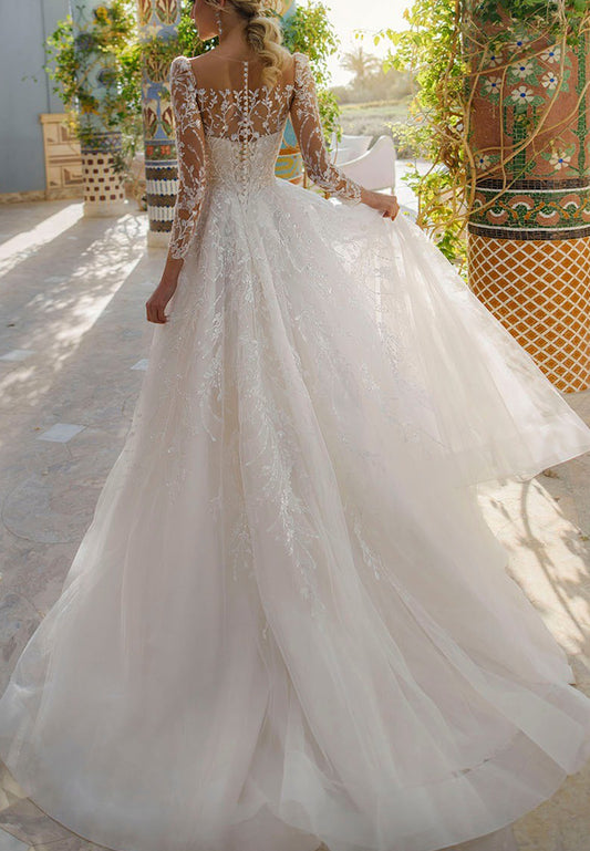 Scoop Long Sleeves Beaded Embroidery A-Line Wedding Dress