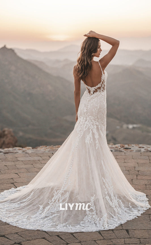 LW313 - Plunging Illusion V Neck Lace Appliques Mermaid Wedding Dress