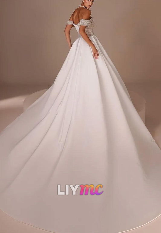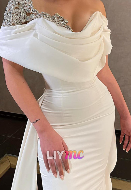 Off-Shoulder Sleeveless Beaded Pleated Mermaid Wedding Dress