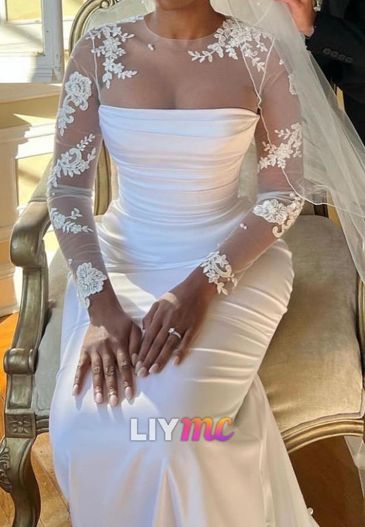 Scoop Appliques Long Sleeves Pleated Mermaid Wedding Dress