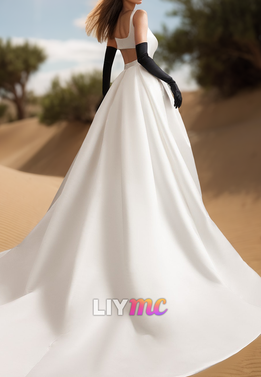 Square Sleeveless Sleek Satin A-Line Simple Classic Wedding Dress