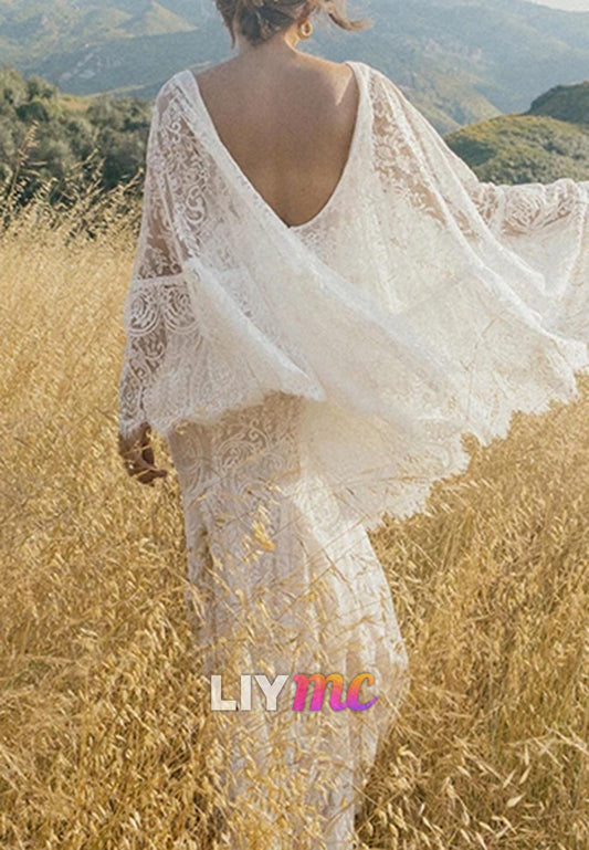 V-Neck Long Sleeves Lace Appliquees Chiffon A-Line Boho Wedding Dress