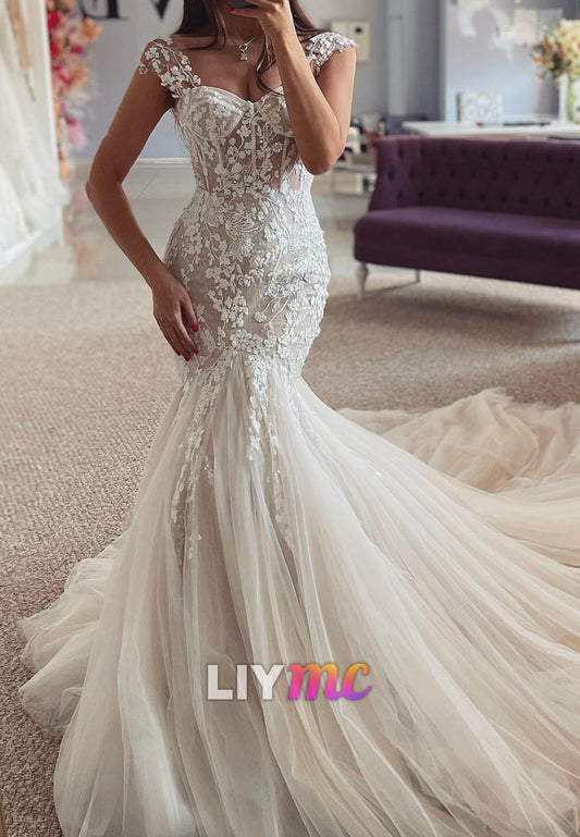 Sweetheart Straps Appliques Tulle Mermaid Wedding Dress