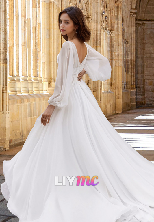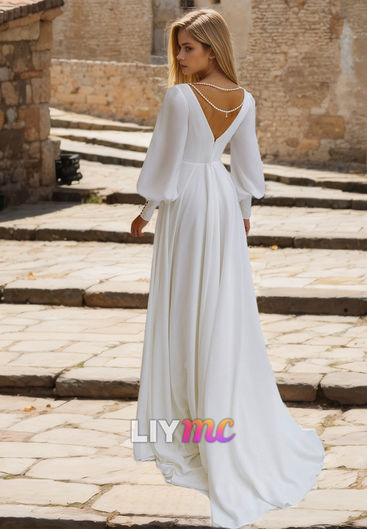 V-Neck Long Sleeves Chiffon Side Slit A-Line Beach Wedding Dress