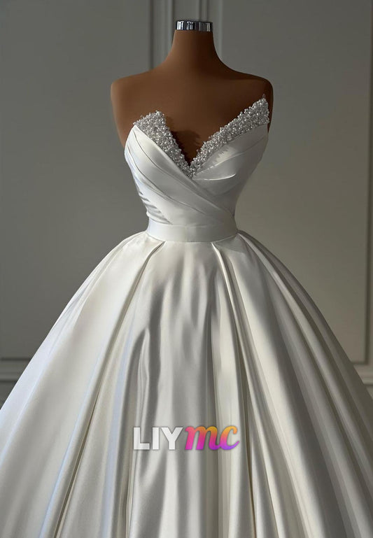 V-Neck Pleated Pearl Sleeveless A-Line Wedding Dress