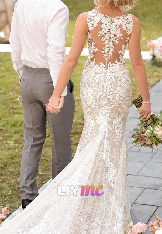 V-Neck Sleeveless Floral Appliques Mermaid Wedding Dress