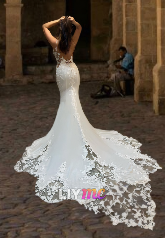 V-Neck Straps Appliques Mermaid Wedding Dress