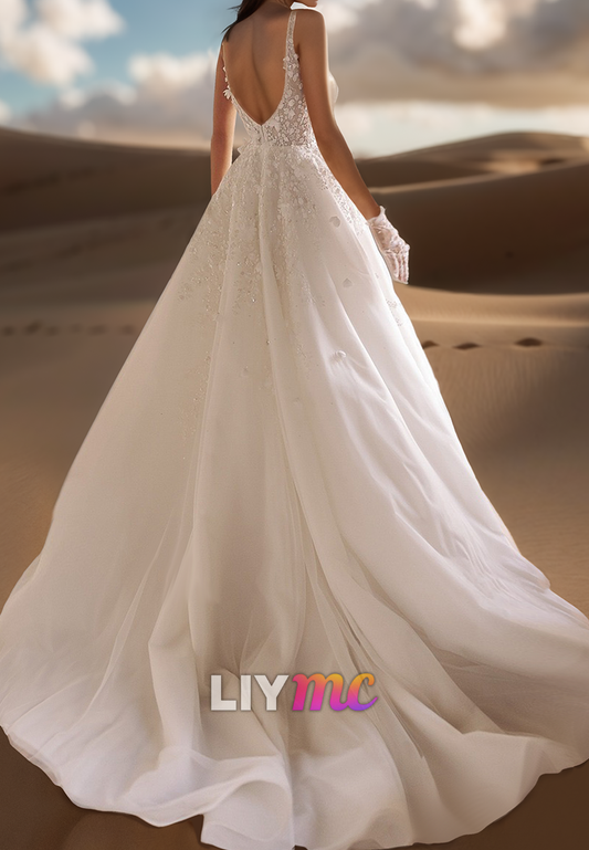 V-Neck Floral Appliques Straps Tulle A-Line Wedding Dress