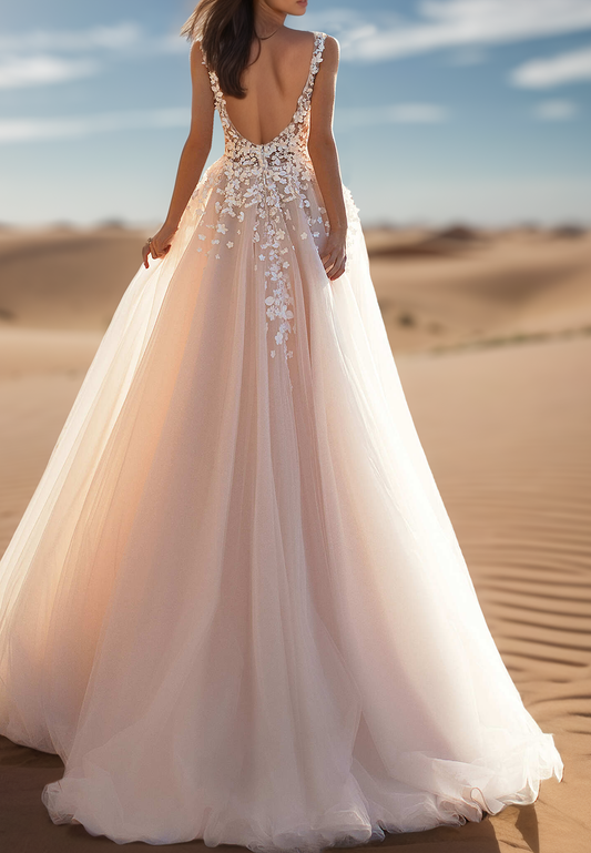 V-Neck Sleeveless Floral Appliques Tulle A-Line Wedding Dress