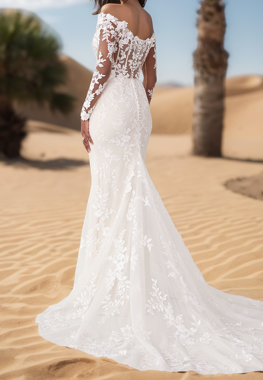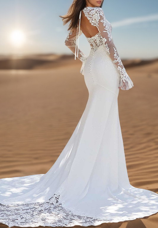 V-Neck Long Sleeves Lace Appliques Mermaid Wedding Dress
