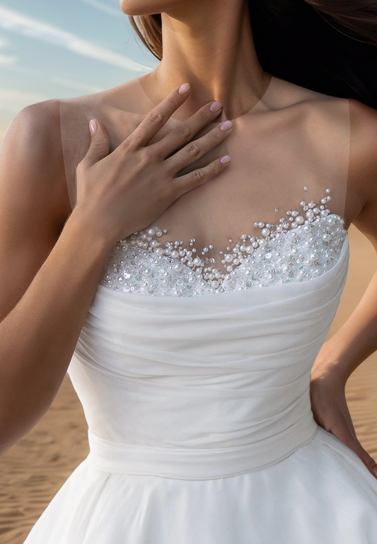 Off-Shoulder Beaded Pleated Long A-Line Beach Wedding Dress