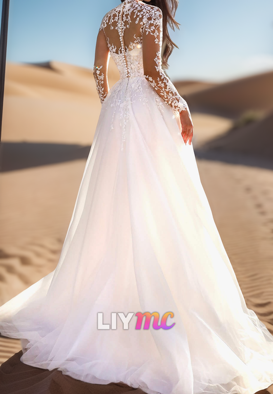High Neck Long Sleeves Lace Appliques A-Line Wedding Dress