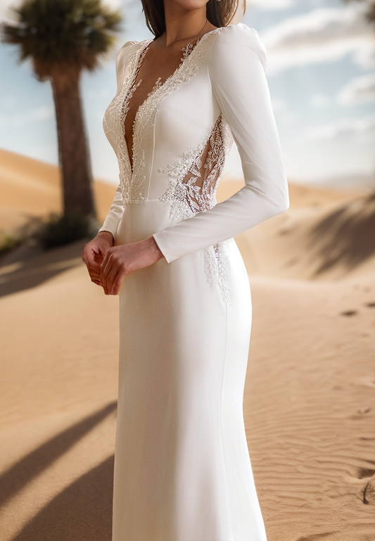 Deep V-Neck Long Sleeves Beaded Sleek Mermaid Wedding Dress