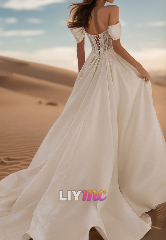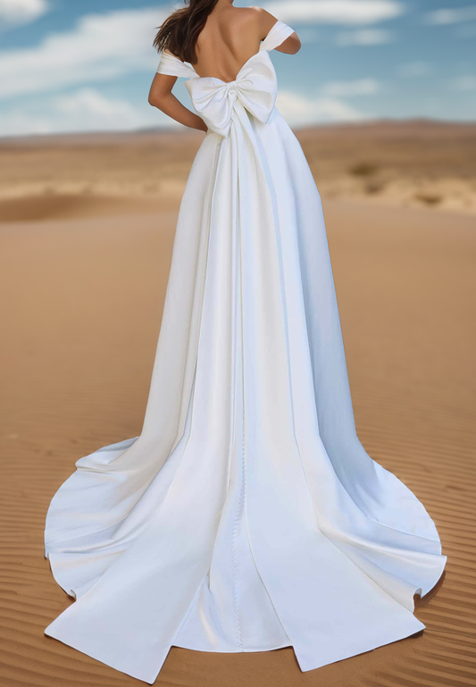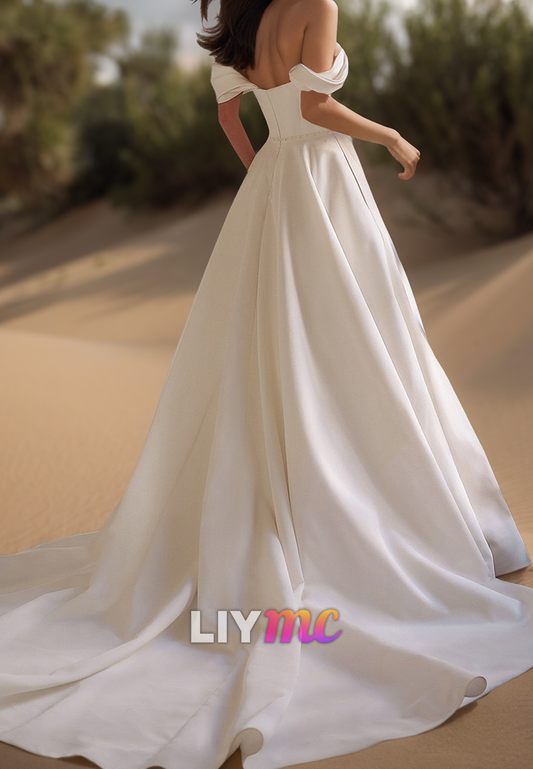 Off-Shoulder Side Slit Sleek Satin A-Line Wedding Dress