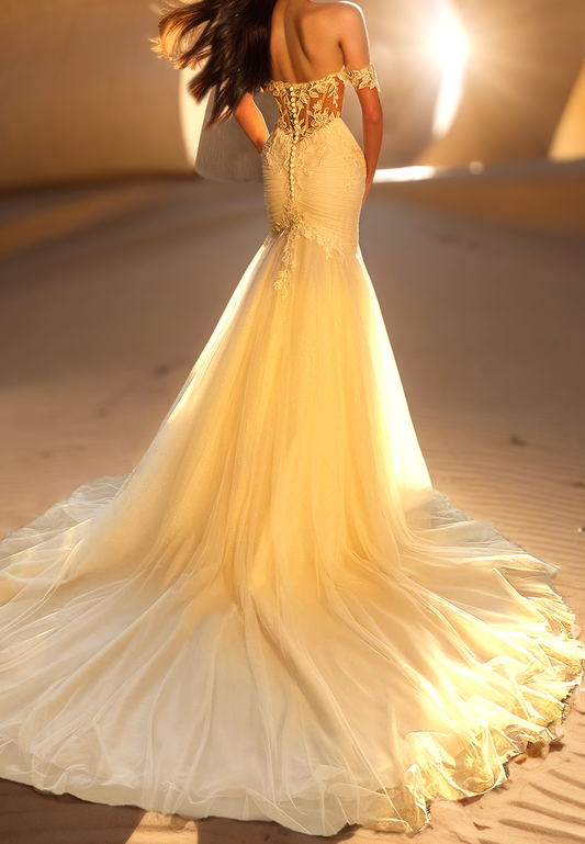 Off-Shoulder Appliques Tulle Pleated Mermaid Wedding Dress