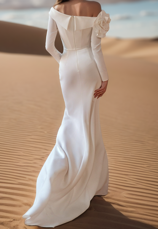 Off-Shoulder Long Sleeves Pleated Side Slit Beach Wedding Dress