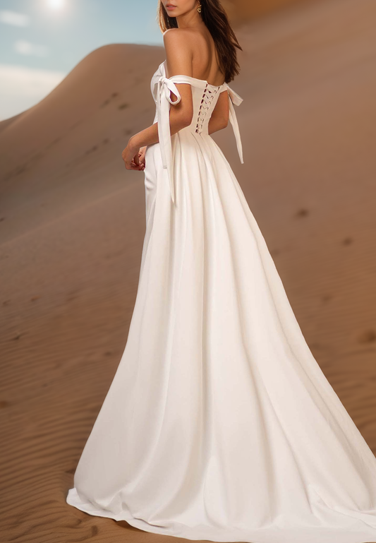 Off-Shoulder Pleatedd Side Slit Beach Wedding Dress