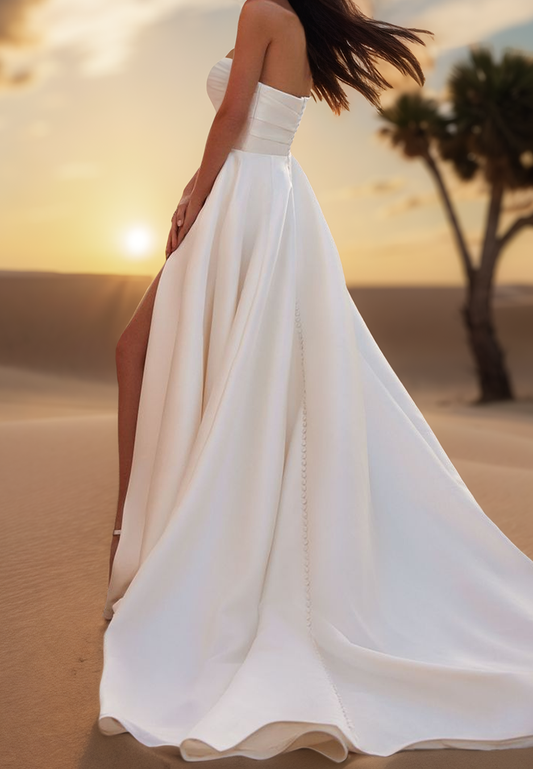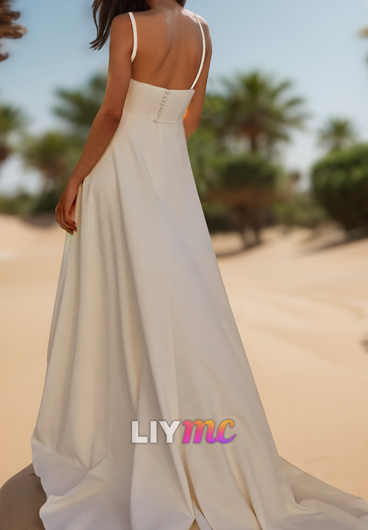 Square Straps Side Slit Sleek Satin A-Line Beach Wedding Dress