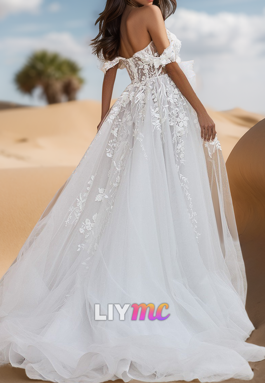 Off-Shoulder Strapless Floral Appliques Tulle A-Line Beach Wedding Dress