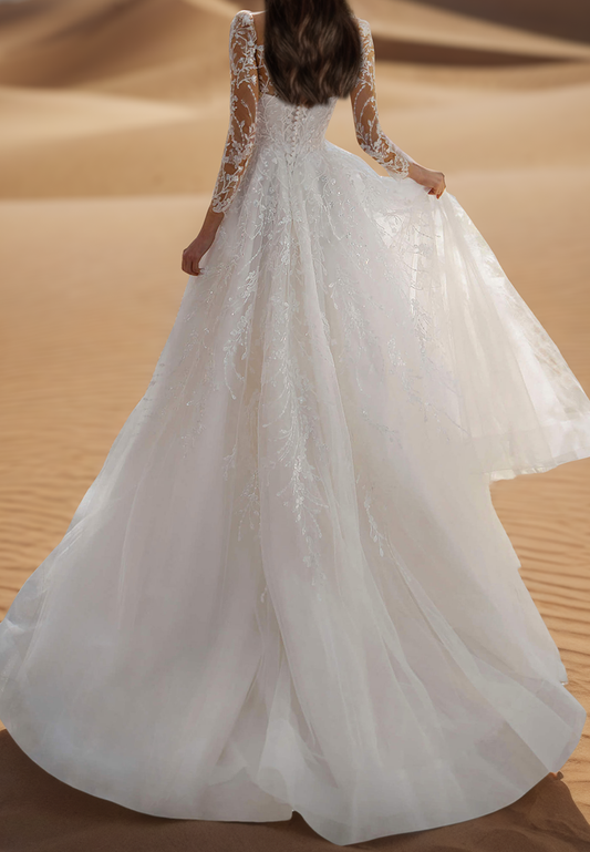 Square Long Sleeves Ball Gown Appliques A-Line Wedding Dress