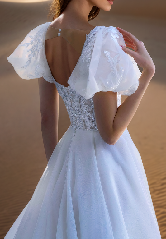 Square Puff SLeeves Appliques Tulle A-Line Wedding Dress